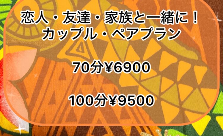 こんにちは!プラチナムアロマ難波店の大城です♪今回はカップルやペアの方にオススメ!【カップル・ペアプラン】全身アロマリンパマッサージのコースをご紹介いたしま