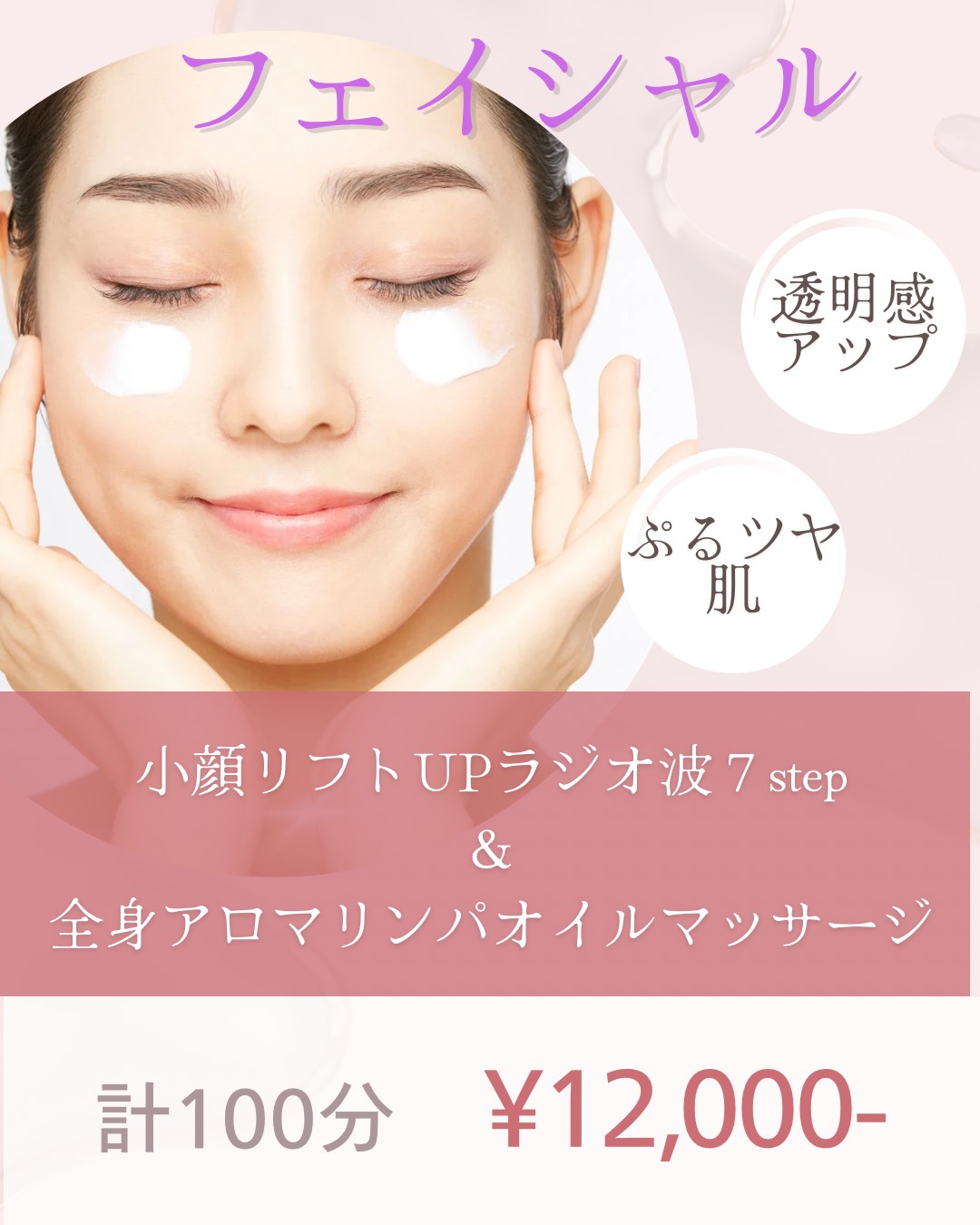(クレンジング→洗顔→小顔ラジオ波→フェイシャルマッサージ→デコルテオイルリンパマッサージ→美肌クレイパック→保湿)
