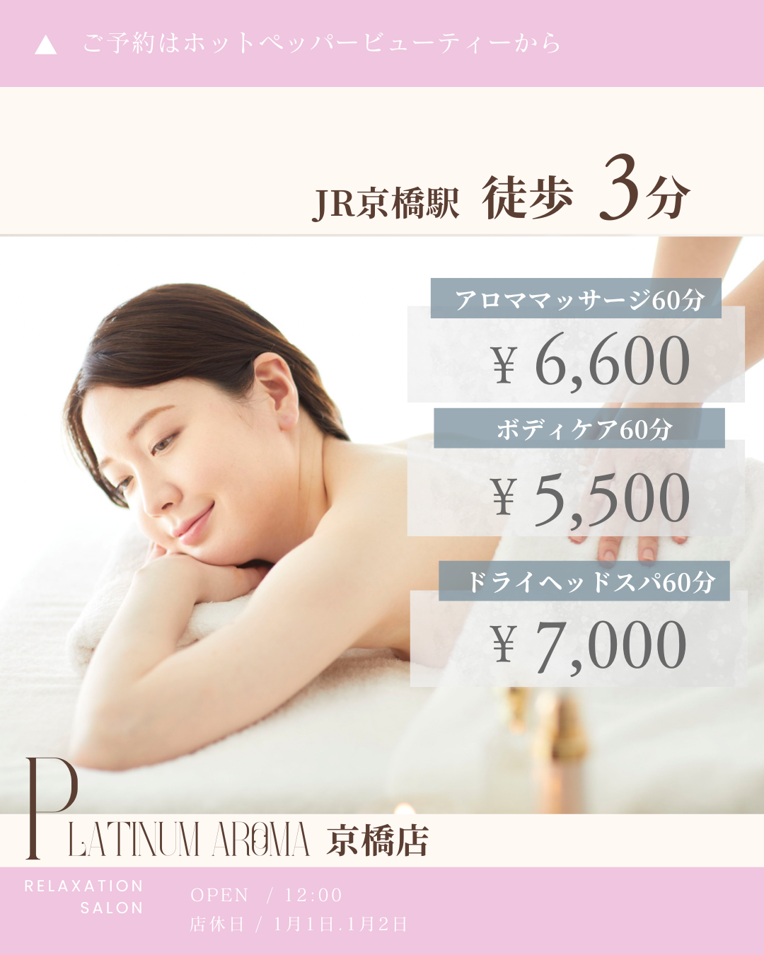 #フェイシャル#ドライヘッドスパ#ラジオ波吸引#大阪市京橋#リラクゼーション#プラチナムアロマ#ボディケア#バリ風リラクゼーション#マッサージ#足裏マッサージ#もみほぐし#カップル#マッサージオススメ#大阪市リラクゼーション#デート#アロマトリートメント #完全個室サロン #男女OK #2人同時に施術#osakaKyobashiMassageSpa