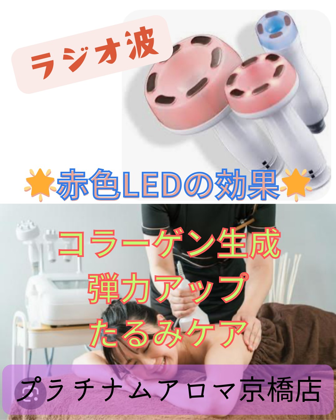 プラチナムアロマ京橋店です当店のラジオ波には赤色LEDの美肌ケアが付いております!