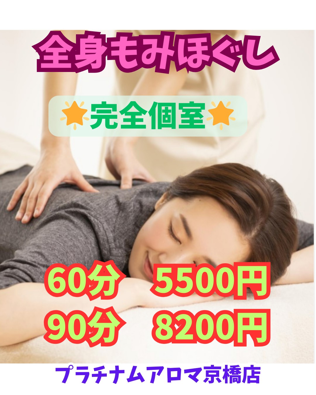 プラチナムアロマ京橋店です\全身もみほぐし/完全個室で、周りを気にせずゆったり