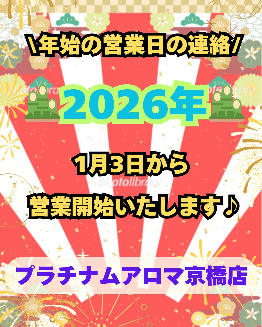 プラチナムアロマ京橋店です年始の営業日のお知らせ1月3日より通常営業いたしま